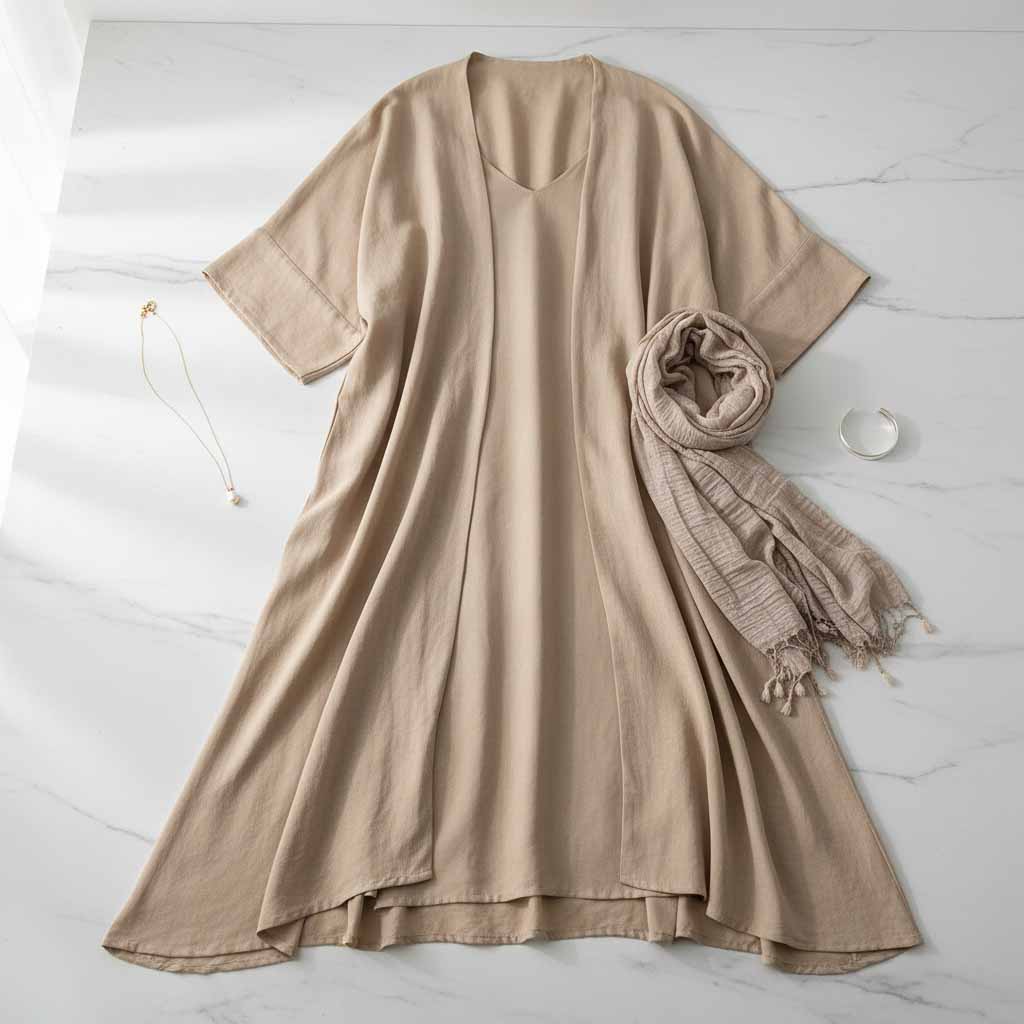 - ست عبایی یا جلو باز + شال نازک + اکسسوری ساده: پوشیده، راحت و محبوب در شهرهای گرم.